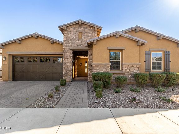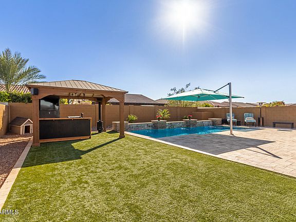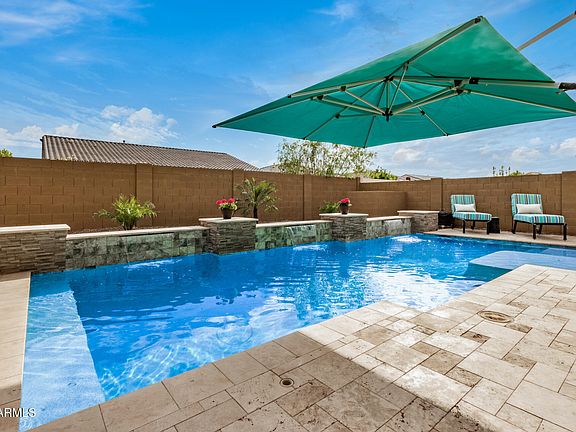 Nestled in the desirable Eastmark community, this 4-bedroom, 2.5-bathroom home boasts a spacious floor plan and an array of premium upgrades. Situated on an oversized lot with a north/south orientation, the south-facing backyard is a true oasis, perfect for both relaxation and entertaining. Step into the heart of the home, where 10-foot ceilings and wood plank tile flooring create a sense of elegance. The kitchen features an oversized island, extended cabinetry, a walk-in pantry, double ovens, a gas range, and stainless steel appliances, all designed for the home chef. The adjacent great room, complete with a custom-built fireplace, offers a cozy gathering space, while a versatile flex room adds functionality as a den, office, or dining area. The split floor plan provides privacy, (MORE) with two secondary bedrooms featuring walk-in closets and the spacious primary suite offering a built-in fireplace, a custom walk-in closet, and a luxurious bathroom with a soaking tub and walk-in shower. The backyard is a showstopper, featuring a sparkling pool with a Baja step and fountains, extended travertine decking, maintenance-free turf landscaping, a built-in gazebo bar area, and a cantilever oversized umbrella with 360-degree rotation. The front courtyard adds charm, and the paid-off solar lease saves an average of $80-$100 per month. Additional features include a 3-car tandem garage with a built-ins, a well-appointed laundry room, upgraded remote fans, and more. This home combines style, functionality, and energy efficiency, making it an Eastmark gem you won't want to miss.