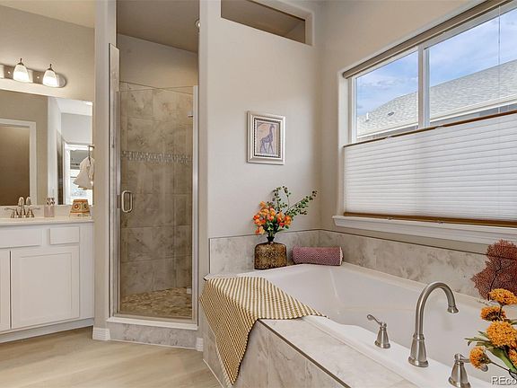 Gorgeous Cascade Ranch home, 1 year NEW, located in the exclusive, SOLD OUT Bradley Ranch neighborhood. This is home will accommodate multi-generational, Luxury Colorado living at it's finest! Main level includes 2 bedrooms with a bonus oversized 3rd bedroom, office, playroom, dining room, or whatever your heart desires with tray ceiling! From the covered porch you can enjoy the sunsets over Pikes Peak and take in the front range. The impressive entry features gorgeous wood floors, 12’ ceilings, and contemporary colors. The OPEN FLOOR PLAN with vaulted ceilings features a wall of windows, and a Chef’s dream for the kitchen featuring oversized sparkling granite island, stainless steel gas stove, white cabinets and massive walk-in pantry. Vaulted Master bedroom features massive attached bath including bidet, pebble stone floor shower & comfort height counters and a master closet that just keeps going! Additional FULL bath with comfort height granite and laundry also situated on main level. Downstairs you will be delighted by the massive recreation room with 9’ ceilings, including Movie Area with 5.1 speaker surround sound which will knock your socks off!, 135” screen & projector, all included! 2 more bedrooms, full bath with bidet & comfort height granite counters, and an oversized storage area complete the lower level. Huge 3 car garage features extra tall opening for tall trucks & 220 v for electric cars. And, that's not all! A/C, Humidifier, Ring doorbell, Nest Thermostat, Vivent Security, Washer and Dryer, Wood Blinds, radon mitigation system, and more! Beautifully landscaped with minimal upkeep, including ground lighting, and paved walkways. Larger lots, walkways, and pocket parks in the neighborhood make for peaceful and friendly outdoor living. Perfectly situated near the Children's Hospital, Target, Lifetime, Wild Rumpus Park, Venezia Park, Shops at the Promenade, trendy restaurants, Air Force Academy, and I-25. Award Winning D20 Schools! This is the ONE!