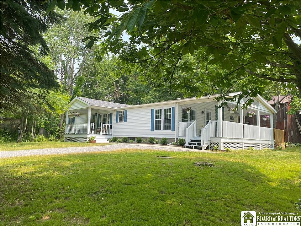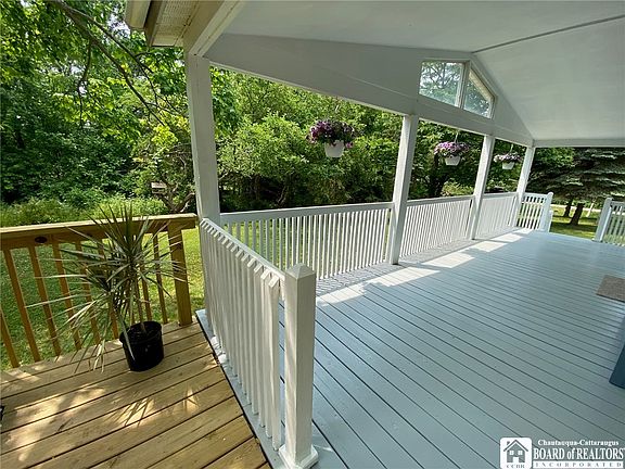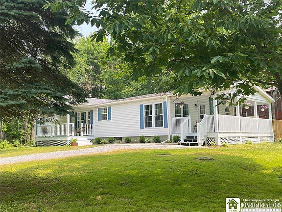 On the outskirts of Fredonia just outside the village! Country yet close! 3 bedroom 2 bath manufactured ranch style home on full, sparkling clean basement. The white, bright kitchen has great counter space & cupboards as well as large windows that pour in daylight! Morning room area of kitchen fits a table nicely & at the other end is a breakfast bar! Around the corner is a more formal dining area & huge living room with stone woodburning fireplace as focal point! Exiting off the living room through the sliding doors takes you onto a brand new 50' foot deck that overlooks nature! The primary bedroom has it's own bathroom with double sinks & shower. New roof this year, new gas line from house to road, all new flooring throughout; freshly painted throughout. New hot water tank; new UV filtered water system! If you are not enjoying sunshine on the deck, experience shade on your 26' foot covered porch! What's left to do-absolutely nothing, completely turn-key! So fresh, so amazingly clean and bright, with views of grapes, trees, wildlife, yet just 1 mile from shopping, stores and schools! Barn can be removed. Great home you can enjoy...see what outskirts of village living has to offer!