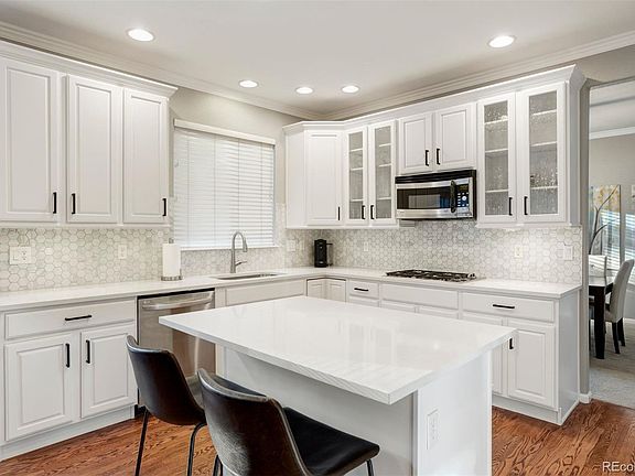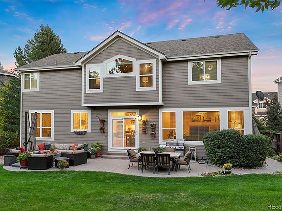 This beautiful 4 bedroom | 4 bathroom residence, nestled in a tranquil, coveted Highlands Ranch neighborhood, offers an exceptional blend of modern upgrades and classic charm. Featuring new windows, doors, and hardware throughout, plus fresh interior paint and an updated kitchen and primary bathroom, this home is truly a rare find. Recently remodeled, the kitchen is a chef's dream with highlights including new quartz counters and tile backsplash, custom beveled glass cabinetry, double ovens, and gas cooktop, all illuminated by elegant lighting. The open concept family room features a gas fireplace and wood floors, and flows to the stamped concrete patio - a perfect space for relaxation. The large, fenced back yard, complete with additional recreation space and filled with mature trees and perennials, is a peaceful retreat. Bathed in natural light from double-height transom windows, the living room flows seamlessly into the dining room, which also boasts large windows framing picturesque back yard views. A bright office with double French glass doors and vaulted ceiling is a perfect workspace. A powder room, laundry room, and 3-car garage complete the main level. The equally impressive upper level has four bedrooms and updated carpet throughout. Primary suite highlights include vaulted ceilings, two walk-in closets, and an en suite bathroom with glass-enclosed shower and dual vanities. Three additional bedrooms offer ample closet space, large windows, natural light, and updated carpet. Two bathrooms, one en suite and the other shared, round out the upper level. The unfinished lower level offers a perfect palette for expansion and provides ample storage space. Desirable Douglas County schools including Redstone Elementary and highly sought after Rock Canyon + Valor high schools are right down the street. Close to shopping, restaurants, trails, and amenities, and within walking distance to Wildcat Ridge Park, this phenomenal home is one you don’t want to miss!