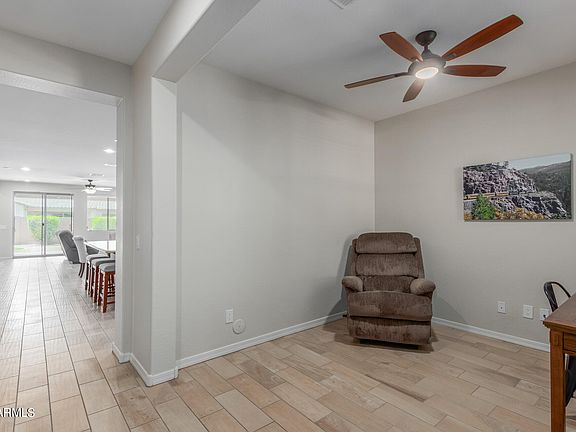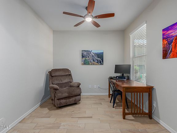 Come and fall in love with this delightful 2-bedroom home in the Adult Community of Encore at Eastmark! Appealing interior boasts wood-look tile flooring, ceiling fans, and a den ideal for work or play. Perfectly flowing great room with surround sound and sliding glass doors to the back patio is designed for entertaining! Impeccable kitchen offers a walk-in pantry, recessed lighting, stainless steel appliances, granite counters, and a center island with a breakfast bar. Venture to the carpeted main bedroom to find a private bathroom with dual sinks, an enclosed glass shower, and a walk-in closet. Spacious backyard has a covered patio that is excellent for al fresco dining or unwinding. A clubhouse, pool spa, fitness center and tennis courts are some exceptional amenities you can enjoy.