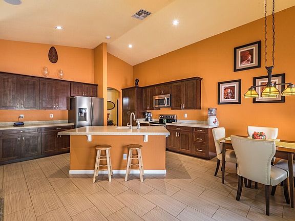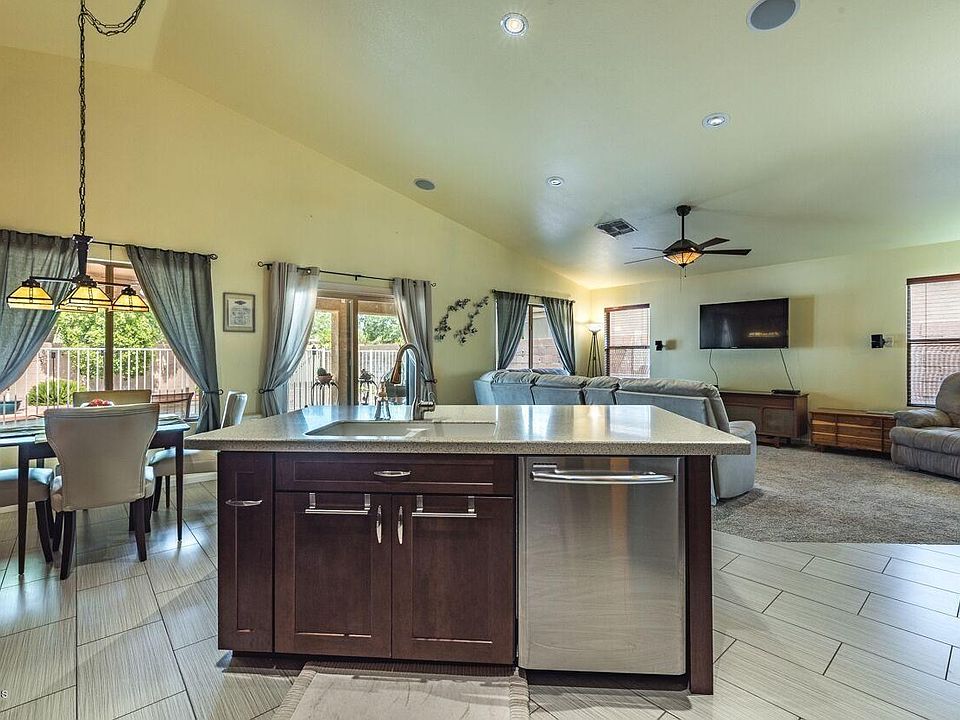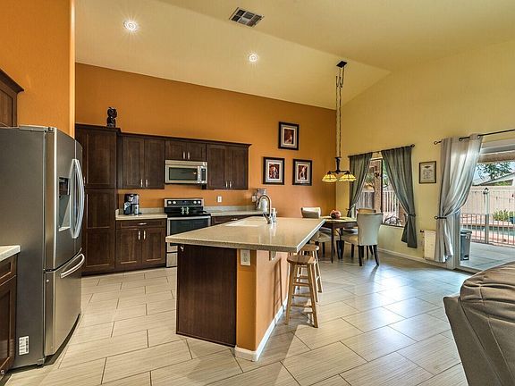 Wow! This home has everything! Open concept one level floor plan with high-end custom kitchen cabinetry boasting pull outs and soft closing features, SS appliances, huge center island and tasteful Corian countertops. The completely updated master bathroom includes custom soaking tub and separate large shower, Corian vanity, mirrors and lighting. Flooring recently updated throughout along with recently painted interior and exterior. Main living area has vaulted ceilings which adds to the light and bright interior. Extended covered backyard patio accents the Pebble Tec pool. Private yard backs to open space. OWNED solar, newer HVAC & water heater, water softener, pre-wired surround sound, N/S exposure and low HOA dues in the beautifully manicured Crismon Creek neighborhood adds to the value!