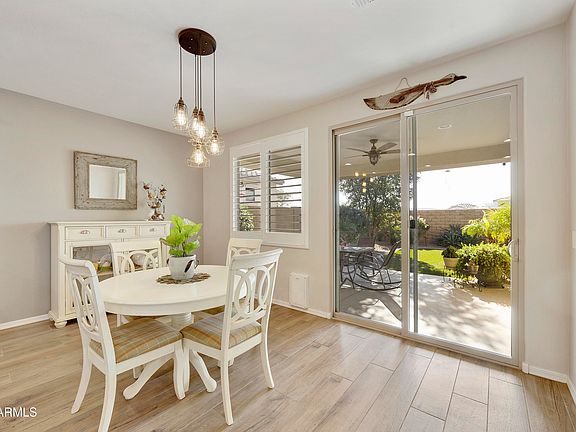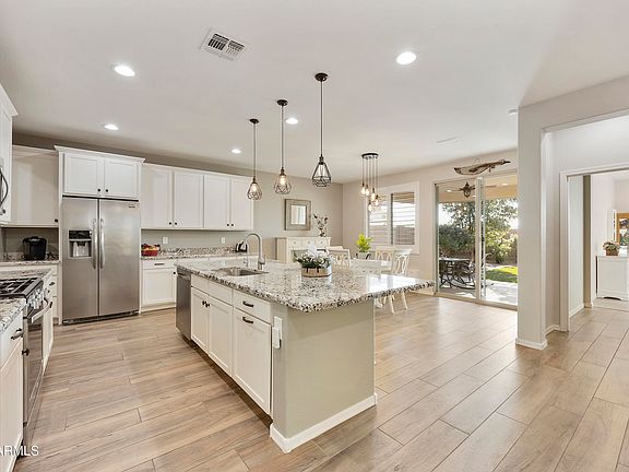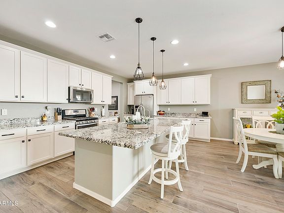 Located in Encore, an award-winning 55+ community offering exceptional amenities. Discover the highly sought-after Charleston floor plan! This thoughtfully designed split layout offers 1,640 square feet of living space with 2 bedrooms, 2 baths, and a versatile den. The inviting great room is perfect for entertaining, while the stunning kitchen boasts white cabinetry, upgraded granite countertops, a large island, gas stove, spacious pantry, and ample storage. The primary suite is a true retreat, featuring an oversized shower, raised vanity with a bank of drawers, and a walk-in closet. Stylish wood plank tile flooring, two-tone paint, and a 2-car garage complete the interior. Step outside to enjoy the easy-care landscaping w/large covered patio and turf. Absolute, must see!