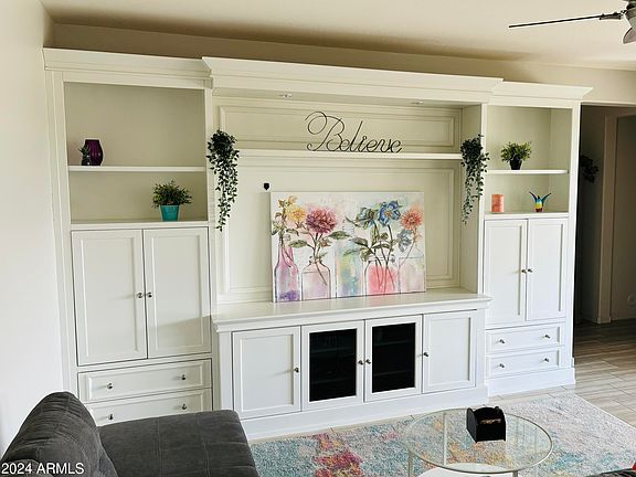 Corner Lot! Adult Community Living at its finest! Property boasts custom cabinets, three skylights, insulated garage door, with custom cabinets in garage! Open floor plan, with large kitchen island for entertaining. Soft water system! Landscaping includes automatic drip system. Back patio includes electric shades with remote. Community includes pickleball courts, pool, tennis courts, game rooms and restaurant. Select furniture available for sale with the property.