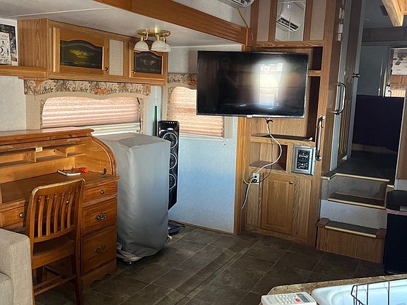 Experience the perfect blend of comfort and adventure with this 32-foot fifth wheel, permanently situated yet movable with some effort. Designed for both relaxation and outdoor living, this unique setup features a cozy Arizona room equipped with a 55-inch Smart TV and a newly installed mini-split system for year-round climate control. Enjoy the ultimate outdoor cooking experience with a black stone grill, pellet grill, and deep fryer, along with a full-size refrigerator conveniently located in the Arizona room. Additional Smart TVs are included throughout the unit for your entertainment needs. The interior boasts hard plumbing and a ceramic flushing toilet for added convenience. A Lifetime 8' x 10' storage shed is included, stocked with useful items like a carpet cleaner and leaf blower. Whether you're looking for a weekend retreat or a full-time getaway, this well-equipped fifth wheel offers comfort, functionality, and a true camping lifestyle with all the comforts of home.