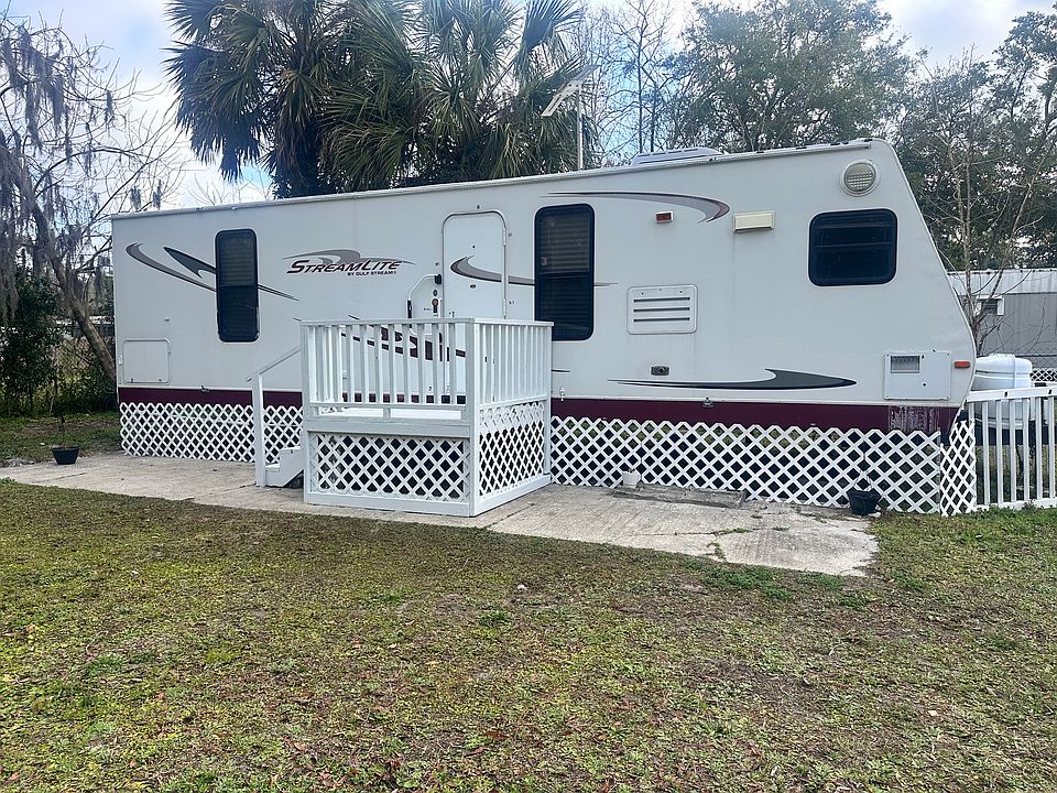 ** RV ** This place is best suited for a single person. RV with a slide out. A/c, running water and electricity included. Brand new porch Appliances have never been used- fridge, burners and microwave. furnished with mattress, double sink, mini desk, couch, sofa, stand up shower and private parking. Electricity is included along with water.