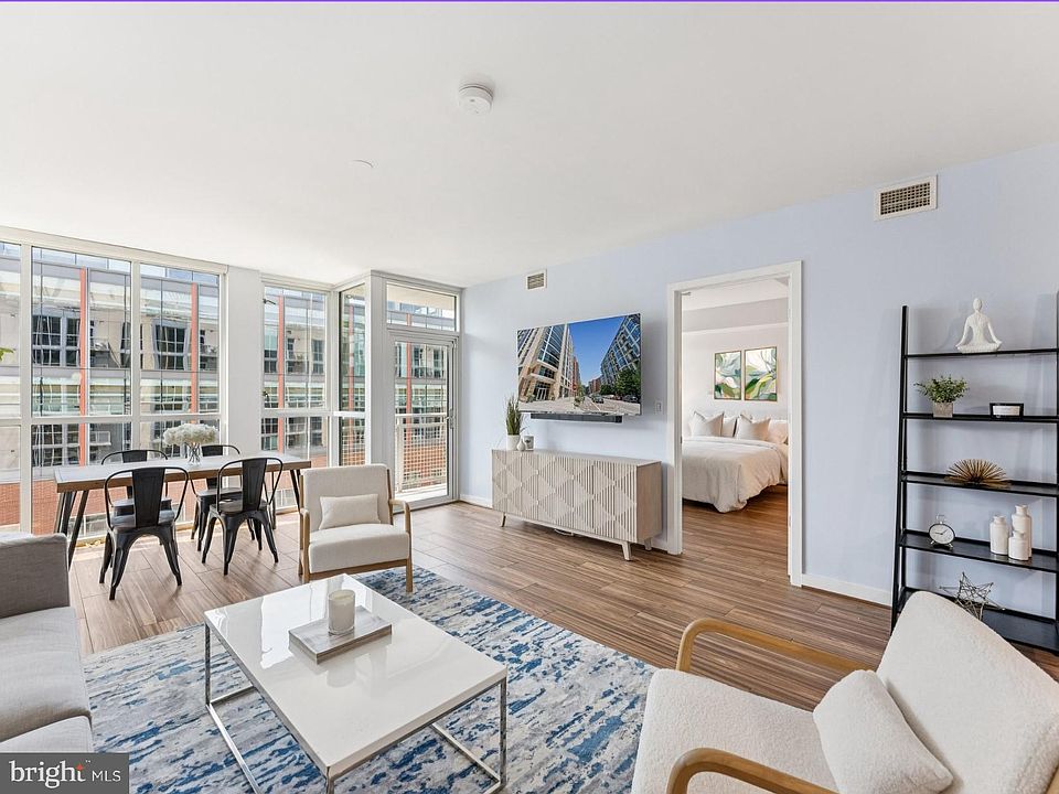Welcome to #1212 at The Velocity, which includes both PARKING and STORAGE, and a brand-new HVAC installed! This residence is 1,065 square feet, with one bedroom plus den and two bathrooms, offering a comfortable and spacious living experience. Step inside the open concept plan, with floor-to-ceiling windows in the main living area. The large kitchen is a chef's dream, with stainless-steel appliances, an eat-in kitchen bar, and an abundance of storage space. The generous layout also provides a dedicated dining area. The living room is spacious and provides access to the unit’s private balcony, where you can relax and unwind. The primary bedroom has large windows with shades for light control, a walk-in closet, as well as an ensuite bathroom with a shower. The den has a custom-made contemporary Murphy bed with built-in storage and integrated desk. This unit also has a full second bathroom. The allure of this property extends beyond its interior, offering incredible amenities such as a rooftop deck with a heated pool. Residents can also enjoy a community meeting room with a chef's kitchen, perfect for hosting gatherings. The large gym, filled with natural light and modern equipment, is ideal for staying active. Families will appreciate the dedicated kids' playroom, and pet owners will find the dog wash station convenient.