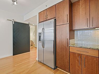 this spacious one bed + den, two full bath condo features floor to ceiling windows with hardwood flooring. The sleek kitchen offers stainless steel appliances, granite countertops with updated lighting and backsplash. The den is currently set up as a bedroom with a queen size bed and two end tables, overhead lighting and a closet, or simply use the bonus space as an office. The large primary bedroom has a completely renovated en suite bathroom with double sinks, new vanity, shower doors and more! Convert to a tankless water heater and free up an entire closet, perfect even more storage space.Enjoy the private balcony and assigned parking space in a secured, underground garage. Contact us to schedule a showing.