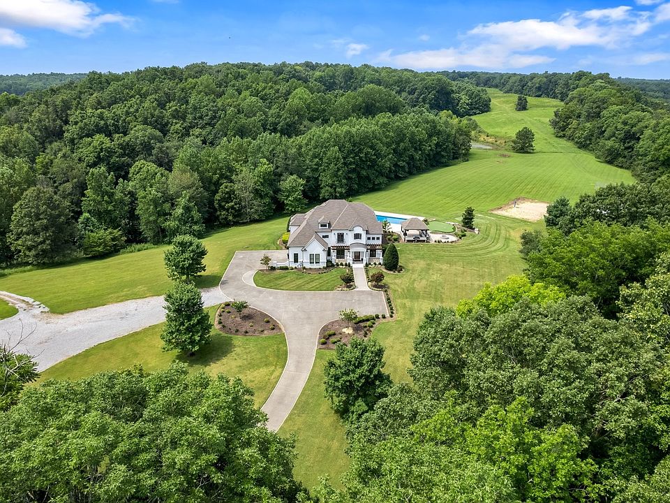 Discover a stunning estate nestled in the picturesque countryside just west of Nashville. This custom-designed home boasts a luxurious primary suite on the main floor, along with three additional bedrooms on the upper level, as well as a lounge area & a screened patio. The chef’s kitchen, paired with an open-concept floor plan, makes entertaining effortless & enjoyable. The seamless transition from the kitchen/living area to the outdoor patio creates a perfect setting for relaxation, overlooking the sparkling pool, outdoor kitchen, spa, putting greens, a driving range, and a volleyball court. The expansive property is enriched with a well-maintained pasture complete wt wildlife food plots frequented by deer and turkey. Noteworthy features include a charming 3-bedroom farmhouse/guesthouse, a heated and cooled workshop equipped with a full kitchen and bathroom, and large overhangs, perfect for equipment, RV's or buses. Two additional barns provide extra storage or potential for horses.