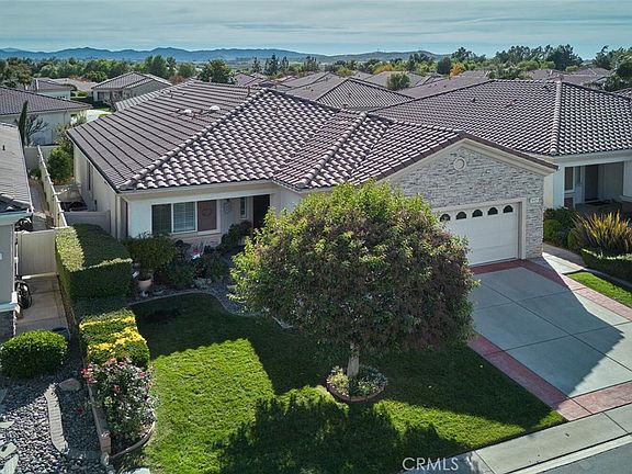 Affordable and spacious "Trillion" home in Solera, a 55+ gated community in Beaumont. 2 bedrooms and an office/den. Fabulous kitchen with granite counter tops, white cabinets, stainless steel appliances that stay with the home. Wood laminate flooring in great room, bedrooms and office. Plantation shutters throughout. Both bathrooms have been remodeled and have granite countertops, white cabinets and designer mirrors. White cabinets in laundry room and the washer/dryer stay. Skylights in the hall and guest bathroom. Custom built closets. 4 newer ceiling fans. Newer furnace. Built -in shelves in office. Special front door. Low maintenance yard. Free internet and basic cable TV included in HOA. The Solera clubhouse has an indoor walking track, gym/fitness center, tennis courts, heated pool/spa, library, bocce ball court, mail room, banquet/meeting/card rooms and pool tables. Just off the 10 freeway with short drives to the Cabazon Outlet Mall, Redlands or Palm Springs. Welcome to the good life!