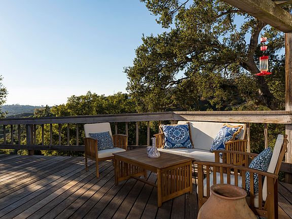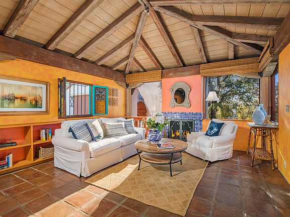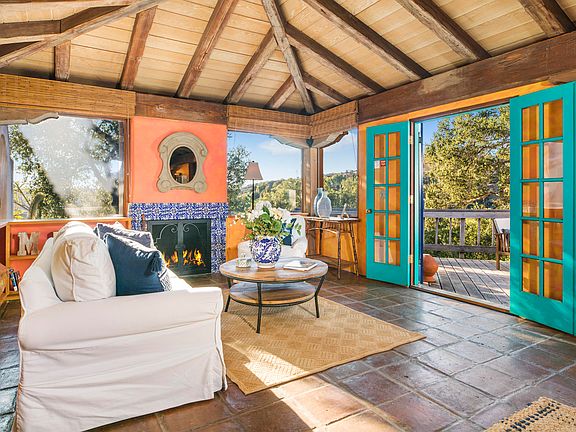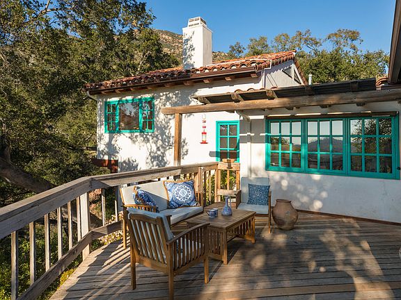 Charm, privacy and huge potential! This artful Santa Fe Spanish style home abounds with custom touches including tile-work, exposed wood beams and stained-glass accents—all beautifully composed to give the home a jewel-box feel, and drenched in light from ample windows. So much more than just a ''2 bedroom'', the main house includes a bonus room perfect for an office or guest space, plus a separate artist studio and even a finished garage. The inviting master bedroom is complete with a Kiva-style fireplace, en suite bathroom and walk in closet. This unique home on 1 acre offers spectacular mountain views, partial ocean views, and a large backyard deck ideal for entertaining. A great get-away just minutes from town, 1025 Coyote Rd. is a wonderful value in an area of more expensive hom