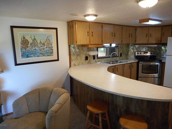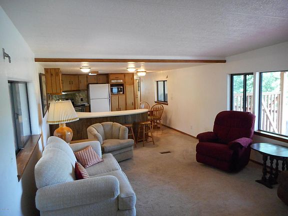 The view from this cabin is so spectacular it is outrageous! Backing Munds Canyon, the hillside and treetop views are endless. The property is on a half acre and sits way back from the street. The original part of the home is a 924 sq foot 1989 manufactured home. There is a large addition that was added in 1996 that includes a master bedroom suite and an oversized two car garage. Front and back covered decks afford maximum exterior entertaining. Large kitchen with breakfast bar opens to living area. Split floor plan. Washer/Dryer laundry room off master suite with an office area adjacent. This property has tremendous potential because of the outstanding views. Wonderful sanctuary front gardens and flowering rock garden in backyard. Fenced dog run, large workshop and multiple access.