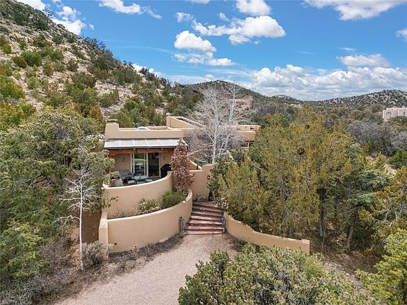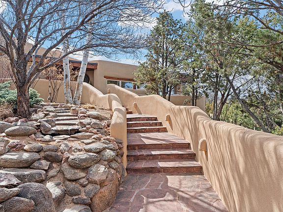The primary suite offers a tranquil retreat with two bedrooms, one of which enjoys a kiva fireplace and a secluded flagstone patio, while the other can serve as a versatile office, den, or exercise space, with access to a private deck and incredible views. Both bedrooms share a spa-inspired bathroom with a double vanity and soaking tub, as well as a half bath. On the opposite side of the home, two additional bedrooms share a stylish 3/4-bath. Coved ceilings, plaster walls, built-ins and nichos enhance the charm and warmth of the home.