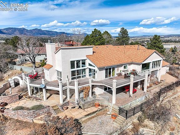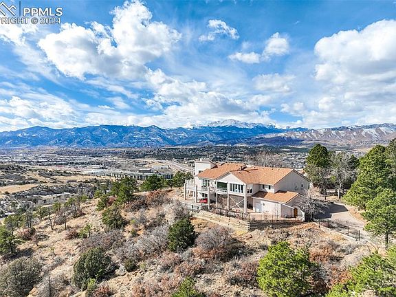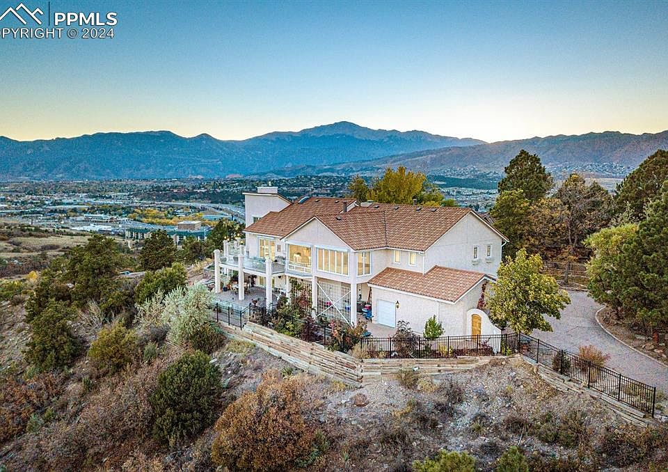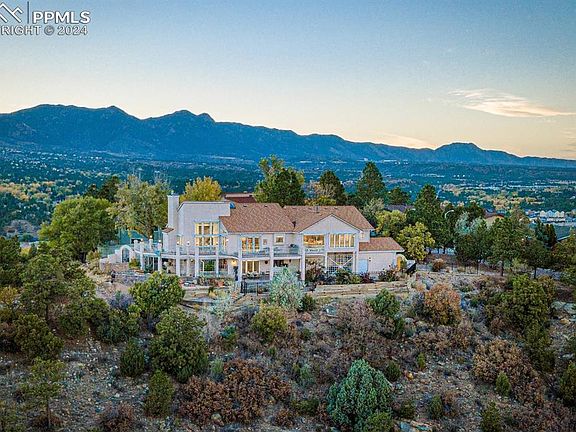 Own one of the most prominent lots in the city, with commanding views of Pike's Peak, Pulpit Rock, and Garden of the Gods; while also experiencing majestic city views. This custom home has notable features and custom design elements throughout the entire home. The gourmet kitchen spares no expense. Tastefully integrated luxury appliances to include 3 ovens, warming drawer, 2 cook-tops, and more. High-end cabinetry, artful stone slabs, and hand-scraped Brazilian wood floors; are anchored by a one-of-a-kind island that serves as the centerpiece of the home. Step outside and enjoy the incredible composite deck, or spend time in one of two living rooms on the primary level. Two dining areas complement the space, including a formal dining room with floor-to-ceiling windows. The Primary Retreat includes a spa-inspired bathroom, private sauna, and sitting area complete with a fireplace. The primary level is complete with another bedroom and a unique tile-inlaid bathroom. The lower level basement features a recreation room, wet bar with a kegerator, two additional bedrooms, guest bathroom, secondary family room, and an executive office that opens to an heirloom quality wine cellar. Step outside and you'll find yourself in one of the most spectacular private overlooks in the entire Front Range. Here, the three-quarter acre lot surrounds an amazing flagstone patio, equipped with an outdoor BBQ area, several serene sitting areas- perfectly perched above the cliff-side ridge and numerous pathways to explore. The attached 4 car garage offers ample storage and workshop space. This property is more than a home, it’s an experience that offers breathtaking beauty for a lifetime.