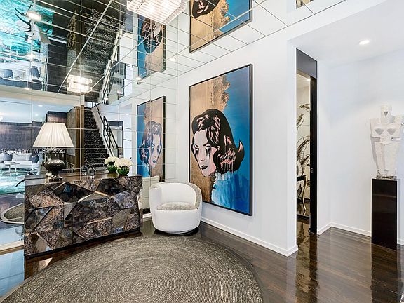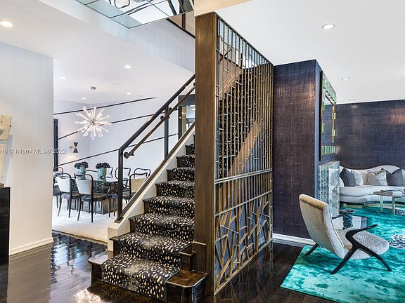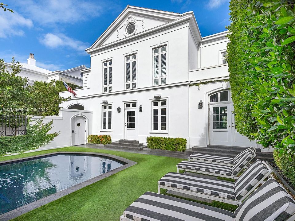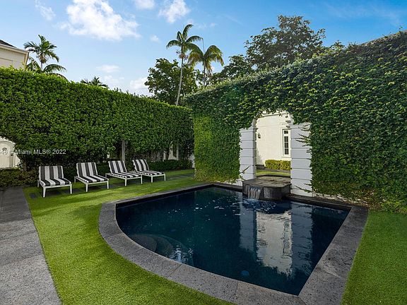 The epitome of chic, this landmark home located in the historic French City Village of Coral Gables features 4 beds + 4.5 baths. Designed by Angelo Rodriguez of Angelo Gerard Group this bold yet quaint home has vivid designs throughout. Complete with substantial renovation, the formal dining encompasses art deco vibes, the living includes an avignon quartzite fireplace and wall coverings by Ralph Lauren Elitis and Contarini. The custom bar is topped with nero marquina marble . The eat-in kitchen is finished with brown Egeo marble, Waterworks hardware, Wolf oven, Bosch, and Subzero appliances. The primary bath is complete with centaurus onyx & walls of zebrino white marble and dual walk-in closets. The arched French doors open to a beautiful courtyard with a pool and black lava stone floors