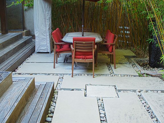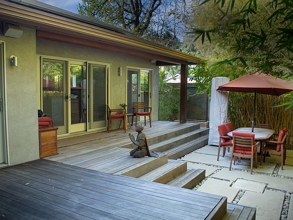 Serene Japanese modern home. This peaceful, green residence runs off of its own solar energy and is a true expression of California indoor-outdoor living and has new central heating and air-conditioning in all rooms of the house.The spa environment includes a hot tub (with ozone sanitation & always ready and hot), zero gravity chair, waterfalls and gorgeous gardens surrounded by secluded wall in the heart of Venice. This tranquil home includes a deep soaking tub as well as a comfortable media room which can be converted into another bedroom if needed. The large kitchen is well appointed with modern appliances including a wine refrigerator. Exquisite outdoor gardens include mangaris decks, a large gas grill , gas fire pit, teak dining table with umbrella, and an intimate meditation area.