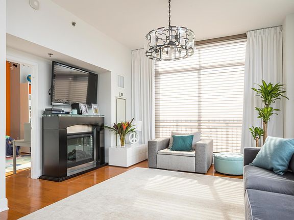 Please contact the owner for an in-person appointment or guided virtual tour. This stunning 1,342 square foot 2 bed 2 bath corner Penthouse combines the modern open layout with elegance and style. This reimagined contemporary living boasts a gracious Foyer with a small den that serves as an office leading to a newly updated Kitchen and Dining area. Thanks to the 10' ceilings and distinguished floor to ceiling windows with picture-frame New Jersey sunsets and Manhattan and Sky views the home is soaked with sunlight throughout the day. The spacious open Chefs kitchen offers natural white stone countertops/backsplash and a large center island providing ample work and storage space. It also features stainless steel appliances and an under-mount sink. Master Bedroom suite features walk-in closet, 2nd closet and custom bath with double sinks, jacuzzi tub, Restoration Hardware brass fittings and separate shower. Spacious 2nd Bedroom connects to 2nd full bath with California closet. The meticulously maintained suite offers an abundance of custom storage perfect for off-season items, custom automatic shades throughout, oversized dining and living room, coupled with low maintenance, and a garage parking spot. Upscale waterfront Maxwell Community offers resort-like amenities, including 2 swimming pools, hot tub, 2 fitness centers, yoga room, 2 playrooms, 2 lounges, landscaped rooftop gardens and terrace with professional BBQ grills, 24/7 concierge, and free shuttle bus to PATH train station. Cultivated indoor and outdoor settings are suitable for engaging and entertaining with ideal space to unwind. Thanks to the beautiful waterfront promenade, surrounding parks, restaurants, and the Hudson River you don't feel the hassle of NYC yet you are only 20 minutes away from Times Square.