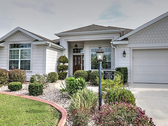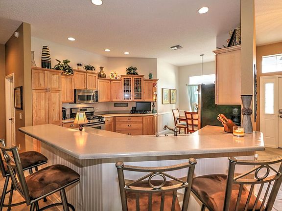 Located in the VILLAGE OF CAROLINE, it's only a 5 minute golf cart ride to LAKE SUMTER LANDING! This is a beautiful CAMELLIA on an over sized corner lot with an enhanced landscaping package! Your 13 Palm trees with custom landscape edging will provide you the true Florida experience. The exterior is built using HARDIE BOARD for durability! Inside the home offers diagonal tile flooring through the living areas, with carpet in the bedrooms. The kitchen features custom cabinetry, Corian counters, gas slide-in range, space-saver microwave, and side by side refrigerator. The master suite is spacious and features sliding door access to the lanai, and double walk-in closets. The master bath has dual sinks, solid surface counters, vanity area, and a tiled walk in shower.