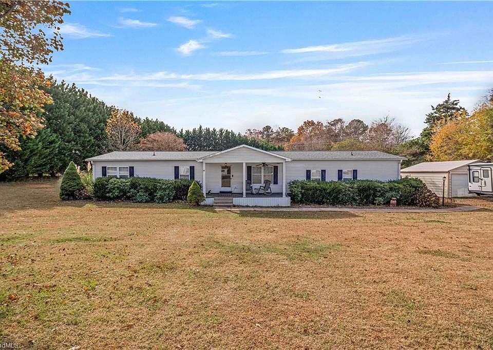 Back on the market at no fault of seller. Doublewide home with impressive space, 4-bedrooms, 3-baths, Den & living room, sitting on 1 acre & includes a 23x25 detached garage/workshop equipped with power, and a wood stove, perfect for hobbies, storage, or a home business. The large, private back yard feels secluded thanks to mature Leyland Cypress along two sides& a wooded area bordering the third side. Ideal for outdoor living & plenty of room to play, garden, or entertain. Enjoy a large covered front porch and a covered back porch. This property offers two wells—one with a newer pump & the second currently capped but available for use if desired. Recent updates include: Fresh interior paint in most rooms, New window blinds throughout (except one room), New dishwasher, new flooring in Den, HVAC serviced in Nov. 2025. Two propane heaters for back up heat. Located on the outskirts of Pilot Mountain, enjoy peaceful surroundings while still being just minutes from town conveniences.