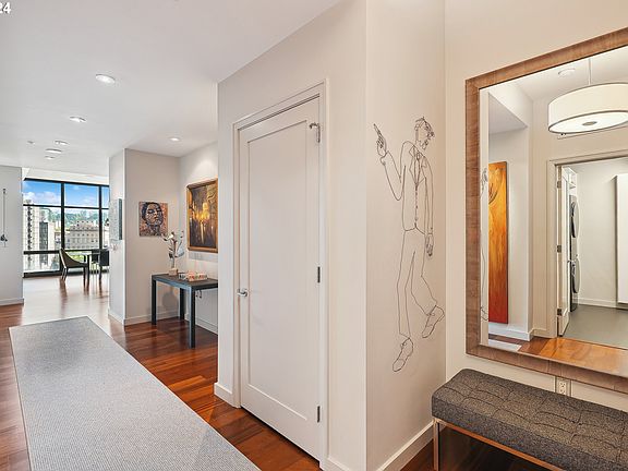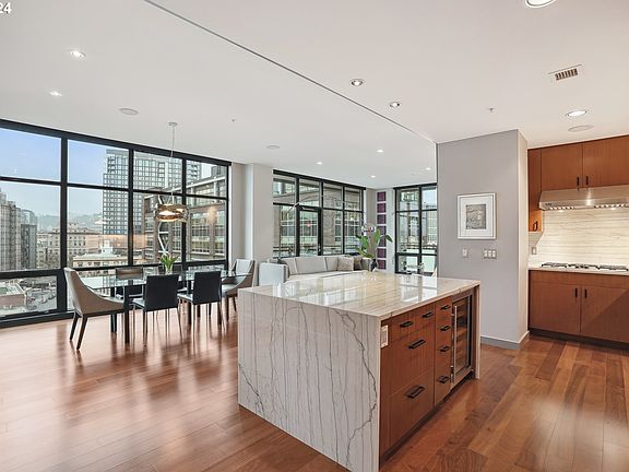 As featured on the cover of Pearl Magazine, this elegantly remodeled corner unit boasts an expansive living space and 270-degree city views from its wraparound balcony. Includes custom kitchen and baths, marbled island, accent walls, designer lighting, large closets, surround sound system, remote control shades in living room & dining, owner's suite and private guest room/office. Ideal parking space deeded to this unit. Enjoy daily concierge service in one of Portland's most sought-after buildings.