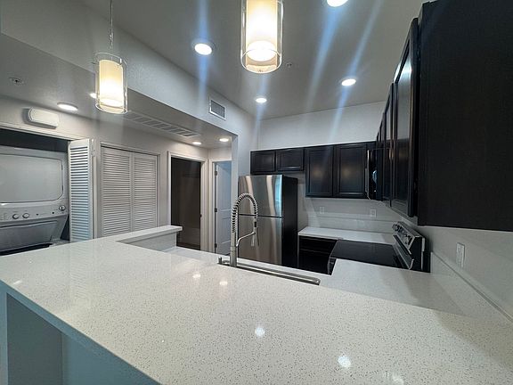 The unit includes a washer and dryer, brand new appliances, and contemporary finishes throughout.