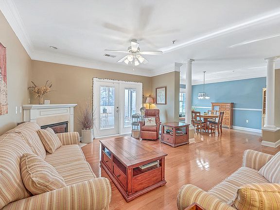 Spacious, open corner unit 2 bedroom, 2 bath condominium for sale in The Retreat at Riverland on James Island. This luxury condo features hardwood floors throughout, crown molding, designer paint, and a screened porch plus covered patio. The large kitchen is just off the entry and has shaker maple cabinets and plenty of counter and storage space. It opens to the living room, with a corner fireplace with gas logs that come on with a switch and quickly warm the space. French doors lead to a nice-sized screened porch that is often converted to a 3-season room. It leads to a covered patio for additional outdoor living space. Architectural columns divide the dining room from the living room and hallway. The primary bedroom has a walk-in closet and en suite bath, while the secondbedroom accesses a full hall bath. A convenient in-unit laundry/utility room has cabinets plus extra storage space. The building includes an elevator. Condo 615 even comes with its own detached garage (#50). The Retreat at Riverland is a serene, gated community nestled in the woods, yet right in the heart of James Island. It's located off of Folly Road between Walmart and the Island Plaza. Shopping, dining, and services are all nearby. Downtown Charleston and Folly Beach are each about a 10-minute drive in opposite directions. The community has on-site staff, a pool, clubhouse with kitchen, fitness center, and a boat/RV storage lot. An attractive outdoor fireplace sits on a screened porch off of the clubhouse, opposite a grilling area that overlooks a pond. Walking trails and a dog walk meander throughout the woods. The neighborhood is active, sponsoring regular events such as a book club, Wine Wednesdays, and movie discussion nights.
