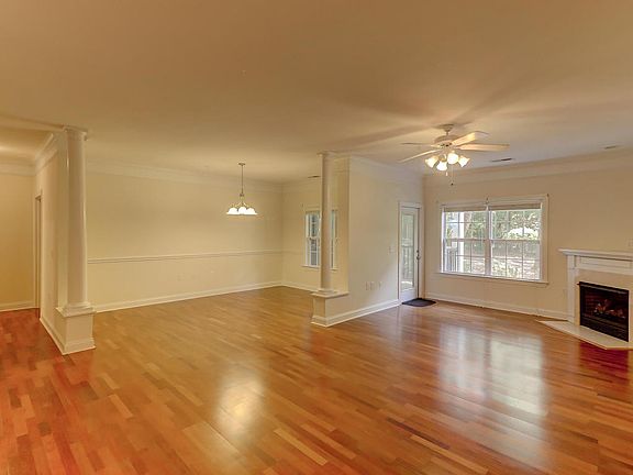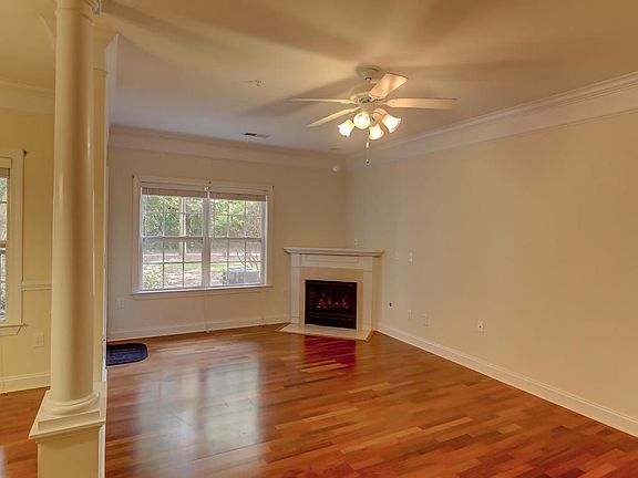 Ground floor condo in this gated building offers convenience and security just minutes to Downtown Charleston and Folly Beach! Wood floors and heavy crown moulding throughout really make this condo stand out! The kitchen boasts all stainless steel appliances with a bar top that opens to the very spacious den. Here you'll find a gas fireplace and double windows looking out to the woods and walking trails directly behind the home. A door leads to the covered patio that is perfect for outdoor entertaining (note the gate in the patio railing for easy access to trails)! A separate dining room overlooks the den/kitchen in an ideal open floor plan! Dual master bedrooms boast beautiful wood floors large walk in closets views of the woods behind this condo and spacious baths with tile flooring. Enjoy a quick walk to the community pool club house and fitness center (optional boat storage also available). This luxury condo offers low maintenance living at its finest so you can enjoy all the shopping and restaurants of James Island or take an easy 5-10 minute drive to Downtown Charleston or Folly Beach!