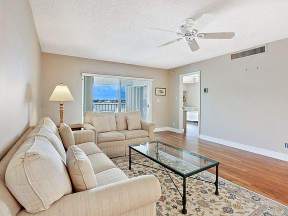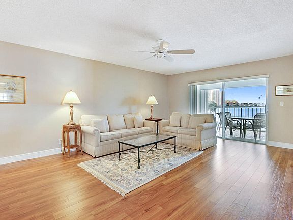 Fabulous long range wide Intracoastal view from this spacious 2 bedroom plus den 2 bathroom third floor condo in Sugar Sands. Watch all the sunsets from your private waterfront terrace with no other condos in sight. Laminate wood flooring throughout entire condo, upgraded kitchen and shows neat and clean. Elevator building and one pet allowed. Assigned parking. Sugar Sands has a renovated clubhouse with extra large pool and is a HOPA community. One resident must be 55 years or older. Walk to beach, shops and restaurants. 1 pet allowed under 24 pounds and cats.