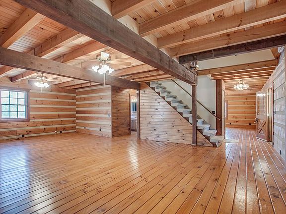 True log home w/ exposed beams in need of some updating and TLC. Nestled on 2.6 acres and backs up to 155 acres of woods. Stone wood burning fireplace. Hardwoods under carpet! Basement w/ music studio and plumbed for bathroom. Priced for As Is sale!