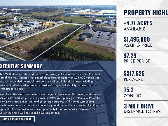1025 W Hudson Rd offers ±4.71 acres of strategically located commercial land in the heart of Rogers, Arkansas. Positioned along Hudson Road with ±31,000 vehicles per day and surrounded by established commercial and industrial users—including Walmart Distribution—the property provides exceptional visibility, access, and development flexibility.