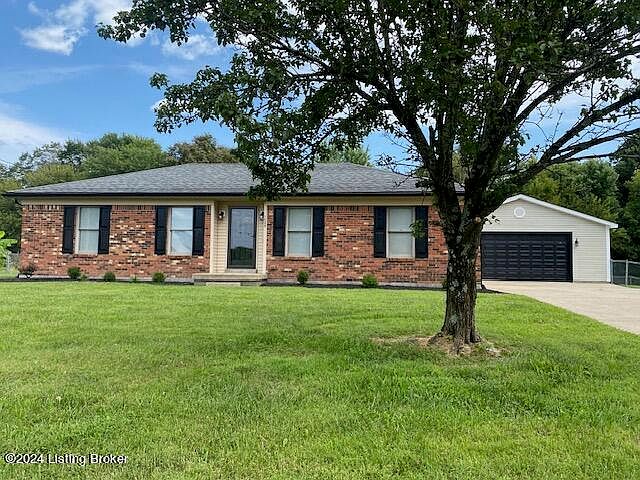 Blink & you will miss this totally updated three bedroom two bath brick ranch style home with detached 28x38 garage situated on half acre lot located on cul de sac street in the quiet country atmosphere of the Woodlawn area of historic, Bardstown, Ky. This wonderful property offers all new lovely hardwood & vinyl plank flooring throughout. It has been freshly painted & updates include all new light fixtures, plugs, switches, countertops, bathroom vanities, faucets & new stainless appliances. Seeing is believing! Enter into the spacious & comfortable Living Room. Eat in Kitchen provides an abundance of painted cabinetry, new countertops & comes equipped with a full complement of new stainless appliances including range/oven, refrigerator, dishwasher & microwave. Nice primary suite with hardwood & primary bath with new vinyl plank flooring, new vanity & faucets. Two additional bedrooms with hardwood & hall bath with vinyl plank floors complete the interior of the home. Venture outdoors to enjoy the fenced back yard that backs up to woods & offers a great deck & patio area to kick back & relax and enjoy the sparkling salt water above ground pool. There is also a 12x12 outbuilding for all those outdoor storage needs. Both the detached 28x38 garage as well as the outbuilding have just had new roofs in 2024. Serene country atmosphere awaits you with this wonderful home located in the Bourbon Capital of the World. Don't Delay! Give us a call today & lets go take a look!