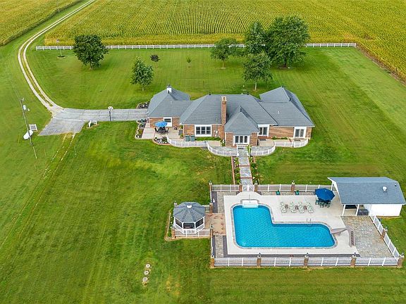 This gorgeous custom built home nestled on 10 acres is sure to impress! As you approach note the serene setting & gorgeous brick exterior of the home. Step inside to find hand scraped hickory real wood floors throughout the common areas. The sprawling family room features a lovely gas fireplace. The well appointed kitchen (appliances stay) boasts granite countertops, breakfast bar, dining area, & ample cabinet storage. The spacious master bedroom suite features an attached bath w/ dual vanity, heated floors, lighted makeup vanity, tub, & separate shower. Also on the main level find bedroom 2 with en suite bath, bedrooms 3 & 4, laundry room, 2 additional full bathrooms, dining room w/ fireplace, & sitting room. Also noteworthy is the amazing outdoor living area featuring new sculpted concrete patios, heated pool w/ 1 year old liner, pool house w/ 1/2 bath, & 30 x 30 outbuilding w/ electric. Features sheet provided in supplements. Horses ok. Adjoining 10 acres is available for purchase.
