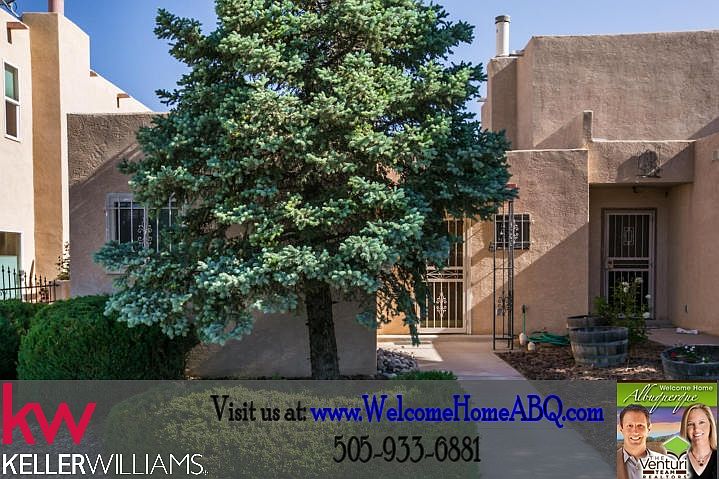 Lovingly cared for 1 bedroom/ 2 bath home in desirable far NE Heights area. Spacious floor plan with inviting & cozy living area. Beautifully built fireplace. Nice, well maintained. Large master bedroom. 3 year old thermal pane windows, and new evaporative cooler. The backyard features a peach tree, covered patio, and backyard access. View this home today!Second bedroom can be used a office/craft room.