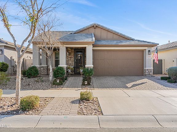 This home effortlessly blends modern design with comfort, offering a refined living experience. Wood-look tile spans the entire home, providing sophistication and easy maintenance. The two-tone paint palette creates an inviting ambiance. The kitchen features a stylish new backsplash, granite counters, and stone accent on the island adding a modern touch. Continuous upgrades, such as lighting fixtures with mood options, custom mirrors in baths, and a stone accent wall in the den, strike a perfect balance between style and functionality. Artistic flair extends to every detail, including doors with inset glass, two custom wood barn doors and shiplap wall. Step outside to a private backyard oasis with a cozy fireplace on the patio, surrounded by low-maintenance artificial turf and carefully curated plants - an ideal space for relaxation and entertaining. Embrace the Encore at Eastmark 55+ lifestyle at the community clubhouse, with amenities like pickleball/tennis courts, a state-of-the-art gym, pool/spa, yoga room, craft room, and various daily activities.
