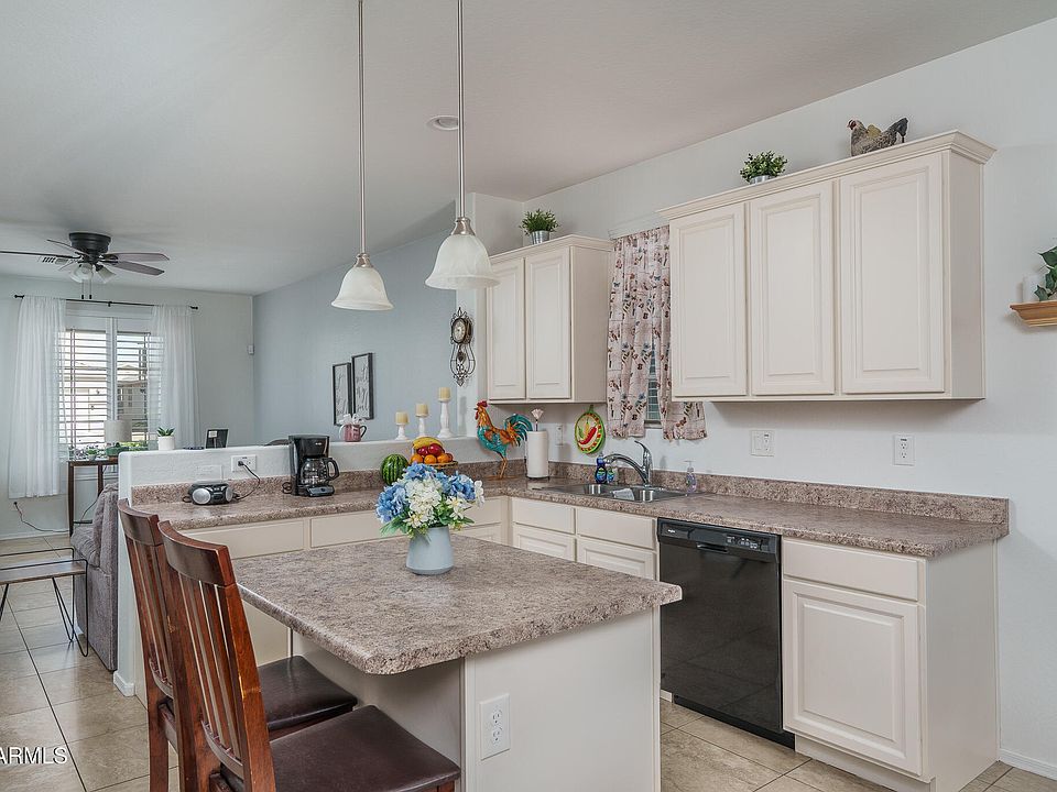 Welcome to this charming single story home with a widened driveway, 3 bedrooms, 2 bathrooms, and an open-concept layout. The kitchen has plenty of cabinet space and a kitchen island with a breakfast bar. The great room has tile flooring and a new window shutter, all other windows are complete with blinds. The primary suite has an ensuite featuring dual sink vanity and a walk-in closet. All bedrooms are move-in ready with blinds, a ceiling fan and laminate flooring. Outside you'll find a large backyard with easy care landscape and a cover patio with a paver extension. Do not miss out on this beautiful home! The community features greenbelts, a playground, and a basketball court!