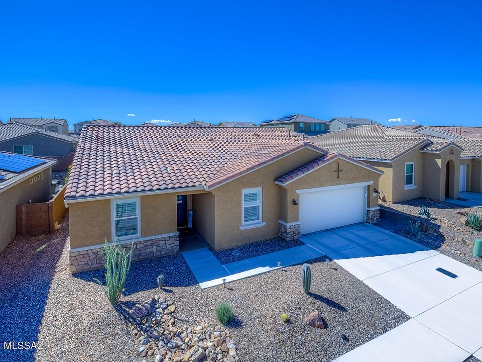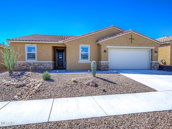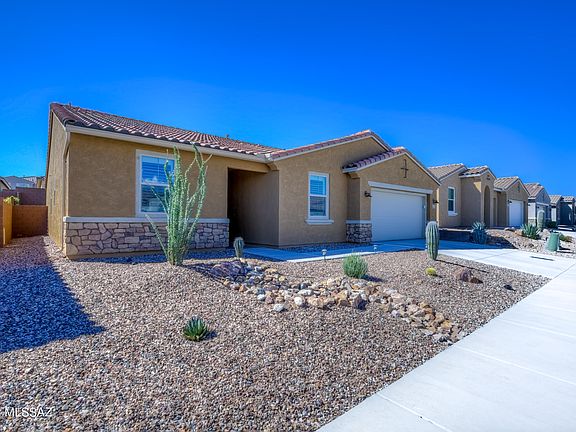 This single story, 4 bedroom plus a den home in sought after Saguaro Trails subdivision is a must see! Attention to detail shows from the gourmet kitchen to the floating shelves in every bathroom, along with handcrafted sliding door in the primary bedroom. Entire home has tile flooring, guest ensuite. Granite counters, tile backsplash, this Agave floor plan has it all. Backyard is finished with turf and pavers. 7 acre community amenity center including pool, dog park, biking trails, multiple play structures. Vail School district. Why wait to build when you can have it all now?