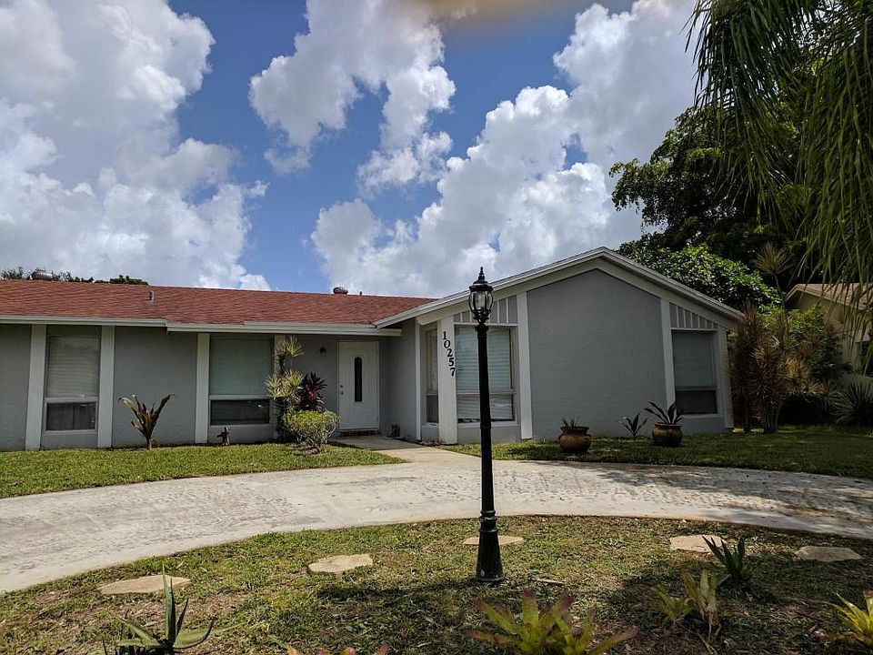 Single family home in fabulous west Boca location of Boca Trails near lots of shopping, great schools, parks and recreation areas. 3BR/2BA with screened patio, large grassy yard and circular driveway. Roof is only 7 years young and interior has been updated with granite kitchen counters, crown molding and neutral paint. No HOA, no fees and no pet restrictions.