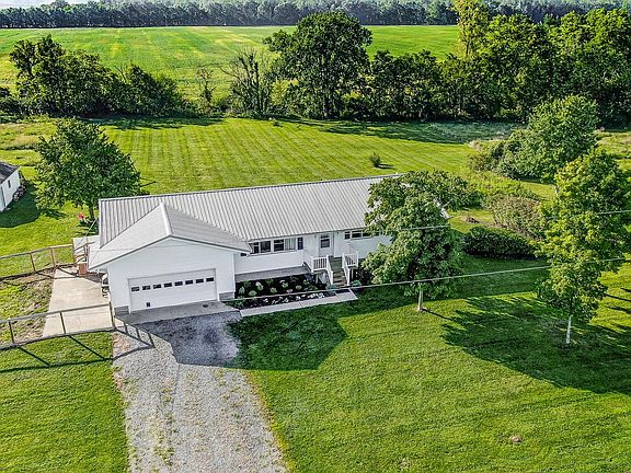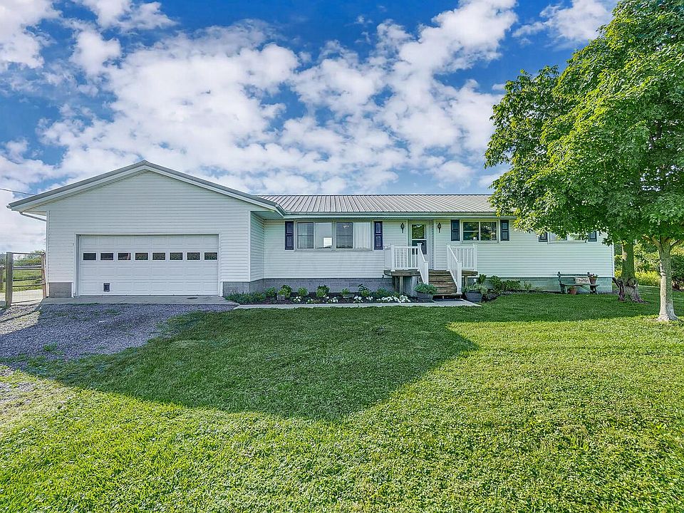 This ranch home sits upon 4.46 acres of peaceful land that has returning fruit trees, perennial flowers, new concrete patio and a stream at the rear of the property. The interior boasts 4 sizable bedrooms & family room most with hard wood flooring, large kitchen for gatherings, plus a massive utility room. If the plethora of closet space doesn't seem like enough, there is a full size basement for plenty of storage. There is a two car attached garage + a large additional detached garage for housing the ATVs, lawn mowers, etc. Ditch the city's water & sewage bills while enjoying the well and septic. Enjoy the evening sunsets in this country setting! Reach out regarding the potential Welcome Home funds to be used towards this purchase.