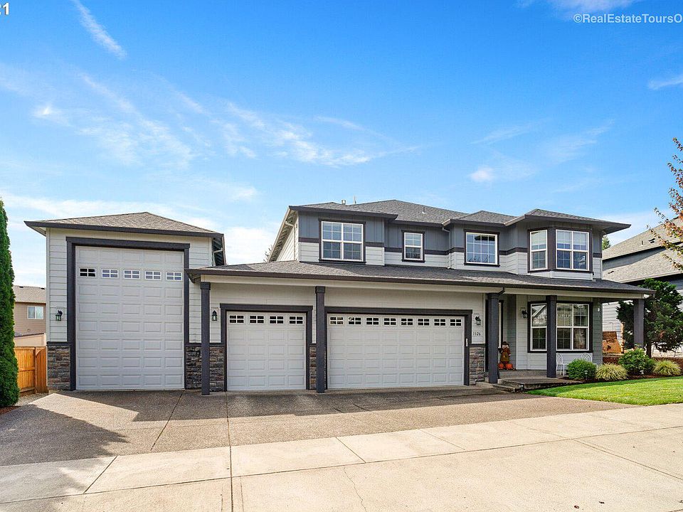 Beautifully designed 5+ bedroom, 4 full bath home. Perfect layout for multi-generation living with two Primary bedroom suites. Gourmet kitchen with island, SS appliances & 2 pantries. Entertain in the formal dining room or casual eating in the eat nook. Relax on the covered deck to enjoy the beautifully landscaped, fenced yard, backing to neighborhood park. 3-bay garage plus extra-deep (41ft) RV garage. Sought after neighborhood, close to hwy access, dog park, schools.