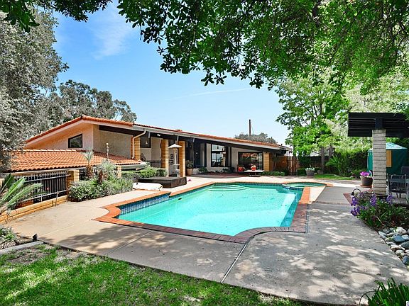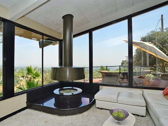 Very special one of a kind home. Spectacular valley/city lights and mountain views. 3 bedrooms on one level, each with it's own bath. Downstairs is a separate studio apartment or office with 3/4 bath. Outside style is Spanish contemporary and inside is done contemporary. Travertine flooring in entry, family and dining area. There is a wet bar in family room area. Step down living room with black granite round fireplace positioned to take advantage of the views from almost floor to ceiling glass windows. Deck off the family/living area with gas firepit. Entering in from the front is a pool/spa and covered pool cabana. Lush landscaping and more views of the mountains. Kitchen has been remodeled with espresso cabinets, lots of storage, stainless appliances, double ovens, microwave, island and more views. Master bedroom has vaulted ceilings. Lots of storage on the property.