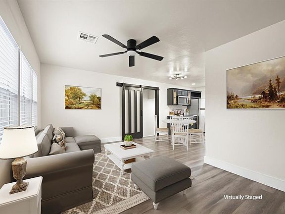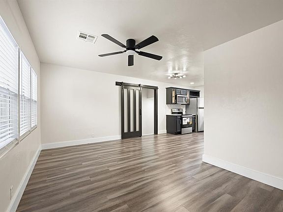 The main living area invites natural light through updated windows, highlighting an open-concept design perfect for entertaining. The kitchen anchors the space with sleek countertops, custom cabinetry, and stainless steel appliances.