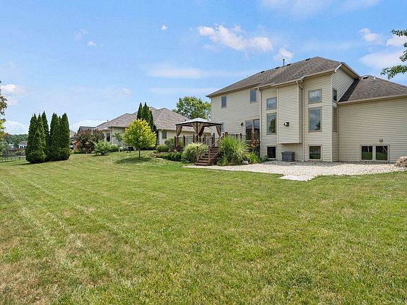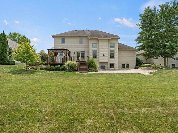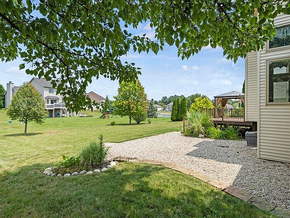 Welcome to your new home in the desirable Lakes of Brooks Crossing community! This stunning home, originally crafted by Carriage Place Homes, seamlessly blends classic charm with modern updates throughout. Step inside to discover a well-maintained floor plan highlighted by a main floor master suite featuring hardwood floors and a luxuriously updated bathroom complete with a freestanding tub, freshly renovated shower, and ample storage. The spacious family room impresses with soaring ceilings, enhanced by natural light pouring in through the windows and a beautiful fireplace with slate surround. Entertain effortlessly in the formal dining room adorned with hardwood floors, or gather around the breakfast bar in the well-appointed kitchen boasting hickory cabinets and stainless steel appliances. A large laundry room and convenient half bath complete the main level. Upstairs, three generously sized bedrooms with hardwood flooring offer ample closet space, complemented by a versatile 9x23 multipurpose room ideal for an office, playroom, closet or additional storage. The finished daylight basement features stained concrete floors, a full bathroom, kitchen area, and an extra room, offering endless possibilities for recreation or guest accommodations. Enjoy outdoor living on the expansive deck overlooking landscaped grounds, enhanced by a new outdoor gazebo for alfresco dining and relaxation with pond views. Additional features include a 3-car attached garage with attic storage, ensuring ample space for all your needs. Recent updates within the past 8 months include a new water softener, high efficiency furnace, Air Conditioning unit, gas stove with air fryer, dishwasher, and front window, ensuring peace of mind and modern convenience. Located just steps from the Pufferbelly Trail, this home combines comfortable living with convenient access to outdoor recreation and amenities. Don't miss your chance to experience the perfect blend of elegance, functionality, and location in this exceptional property. Schedule your tour today!