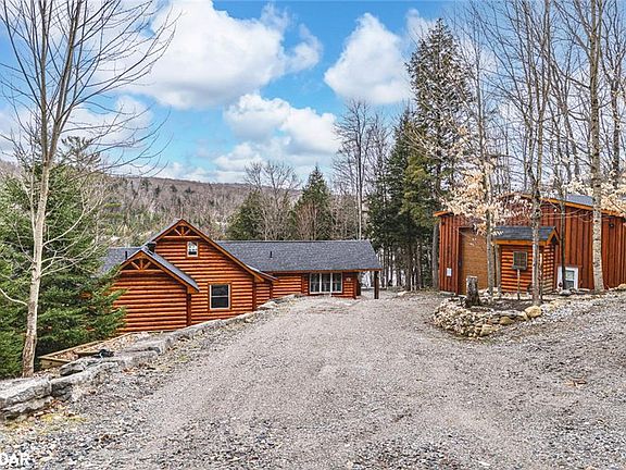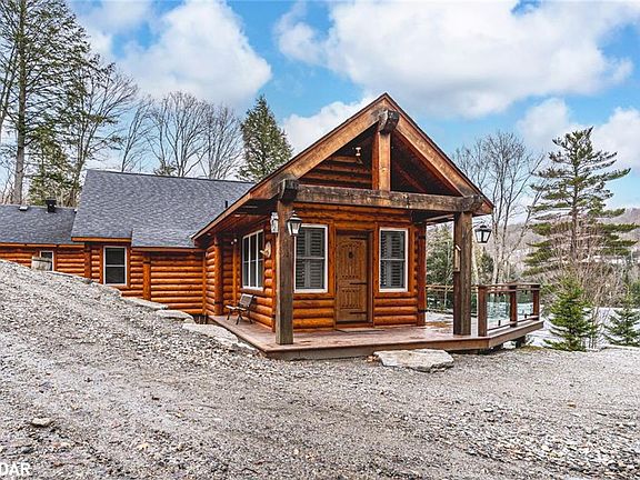 ***SOLD FIRM, AWAITING DEPOSIT************** CUSTOM LOG HOME ON TEDIOUS LAKE WITH 156 FT OF SHORELINE & A MASSIVE 1200 SQFT SHOP ON 1.88 ACRES! Tucked away on the shores of Tedious Lake in Haliburton, this stunning log home is where unforgettable memories are made, and lake life fun begins! Set on a private 1.88-acre lot with 156 feet of shoreline and breathtaking views of Sir Sam’s Ski Hills glowing at night, this property delivers a year-round escape like no other. Swim, boat, or fish right from the 8x30 ft dock, where the water depth reaches approximately 85 ft, ideal for casting a line for rainbow trout, brook trout, or bass. The landscaped grounds feature vibrant gardens, a large fire pit for late-night stories, and a bunkie with hydro that sleeps four. Inside, 22-foot vaulted ceilings, hardwood floors, California shutters, and oversized windows flood the space with natural light and lake views. Multiple walkouts lead to a beautiful wraparound deck. The white chef’s custom kitchen shines with Caesarstone countertops, subway tile backsplash, high-end appliances, and a walk-in pantry. Slide-open barn doors reveal a peaceful primary retreat with lake views, a walk-in closet with built-in organizers, a spa-inspired ensuite with shiplap accents, a freestanding tub and a separate shower. There’s also a main bath with a massive rainfall walk-in shower and custom vanity, a convenient laundry/mechanical room with hookups, and an airy loft offering flexible space for overflow sleeping or living space. A 1,200 sq ft heated shop/garage with a 13 ft front door, mezzanine, and parking for four vehicles is ready for all your toys and projects, plus a Generac 16,000 kW generator keeps everything powered. Only minutes from Haliburton Forest trails and local hotspots for steak and seafood, this is where the adventures begin, and the good times never end!