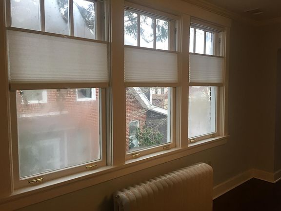 Second floor 2 bedroom, 1 bathroom Regent Square apartment with lots of windows and great light in every room. This 1450 square foot unit has a private balcony, washer/dryer included (in basement), garage with remote opener, dark wood plank flooring throughout, eat-in kitchen and separate dining room, newer gas range, bottom freezer Energy Star refrigerator, dishwasher, large kitchen pantry, walk-in closets, honeycomb shades on windows. Fireplace is decorative. Quiet, clean hot water heat; window A/C for 1 bedroom and Living room included. Quiet, friendly neighborhood one block from the center of Regent Square and two blocks to 660 acre Frick Park hiking trails. Conveniently close to bus routes 61B, 71, P71 on Braddock, and Squirrel Hill shops and restaurants. One small dog or cat allowed with $200 pet deposit and $15/mo pet fee. No smoking anywhere on property. Owner pays for trash and recycling. Tenant pays electric, gas and water/sewer.