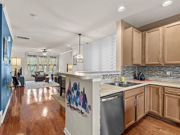 Cary Park 3 bedroom ensuites townhome with sunny southern view of trees & quiet, open space in rear. One owner since built & lightly lived in, no pets & lovingly maintained. All 3 bedrooms have attached full baths plus powder room for guests. Bedroom#3/flex space is on main level where there's washer/dryer area. Open concept on 2nd floor with gas slate fireplace to welcome guests in living room & dining rooms. Dining room has trendy light catching wall & accent wall and modern updated light fixtures throughout home. Kitchen has tile backsplash, island, pantry, S/S fridge, new dishwasher in '23. Back door leads to deck off kitchen. Third floor has primary bedroom with nook and 2 walk-in closets. Don't forget to look behind doors in front bedroom #2 for massive walk in closet with window and full bath too! One car garage has super long closet and set up as work/hobby area with granite top cabinets that convey and a convenient retractable side work table area. HOA rental cap & Pool. Roof, windows & exterior maintenance by HOA -see MLS docs. Easy commute near I540. Ideal location by future pickleball Park & shops!