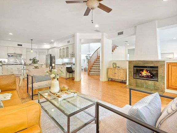 Welcome to this beautifully maintained 3,150 sq ft residence on a desirable corner lot in the Seabright community in coastal Carlsbad. With a three-car garage, a U-shaped driveway for ample parking, and lush tropical landscaping, this home delivers the space, style, and location. Step inside to a grand entry leading to a formal living room, perfect for welcoming guests. The layout flows seamlessly into the dining room and a spacious great room, featuring a cozy double-sided fireplace that connects to both living areas. The open-concept kitchen is a chef’s dream, boasting white cabinetry, granite countertops, stainless steel appliances, a walk-in pantry, and a sunny breakfast nook. Hardwood floors throughout the majority of the main level enhance the home’s warm and inviting feel. Ideal for multigenerational living or visiting guests, the first floor also includes a generously sized guest bedroom and a full bathroom. Upstairs, a stunning winding staircase leads you to a well-designed second floor featuring three additional guest bedrooms plus the primary suite. One guest room includes an en-suite bathroom, while the other two share a convenient Jack and Jill bath. A dedicated laundry room with a sink adds functionality. The expansive primary suite is your private sanctuary, complete with a balcony overlooking the serene backyard, an en-suite bath with a soaking tub, separate shower, dual vanities, travertine flooring, and a large walk-in closet. Escape to your private backyard oasis, surrounded by palm trees and lush landscaping—ideal for relaxing, entertaining, or enjoying the coastal breeze. Just a two-minute walk to the award-winning Poinsettia Park with tennis and pickleball courts, turf soccer fields, a playground, dog park, and more. Walk to top-rated Pacific Rim Elementary, and enjoy easy access to Carlsbad State Beach (only 2 miles away), Legoland, shopping, dining, and the 5 freeway. HOA offers RV Parking! This stunning home offers the perfect blend of comfort, space, and coastal lifestyle. Don’t miss your chance to live in one of Carlsbad’s most coveted neighborhoods!