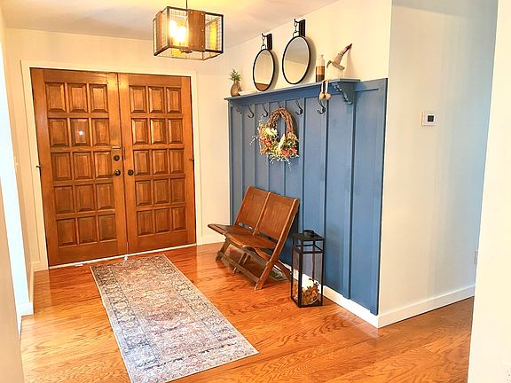 You'll relax when you walk thru the doors of this light airy renovation with style & flow! Inside double front doors, a wall of wainscoting greets you in the foyer. Plenty of room to gather around the fireplace in the living rm. Find serenity in the views across country fields. Spread out in the well-designed kitchen w lots of extras. Thoughtful laundry rm design makes the work efficient. Open dining area with adjacent sun rm, sliding doors for flex use as sitting area, office, exercise, hobby rm. Split flr plan with 2 primary bedrooms & attached full baths. Total 4 bedrooms, 3 full bathrooms. Unwind on the patio in dining, grilling and fire pit areas. Attached & detached garages, workshop. Dog fence. All this on 1.5 acres. Move-in ready!