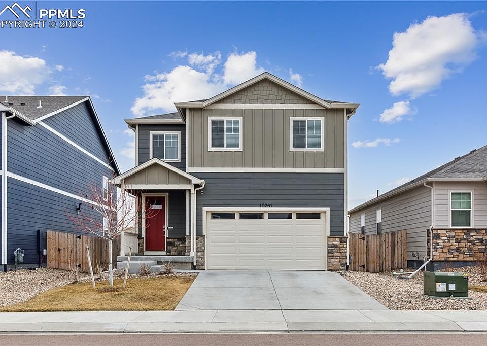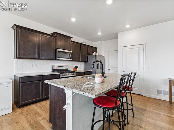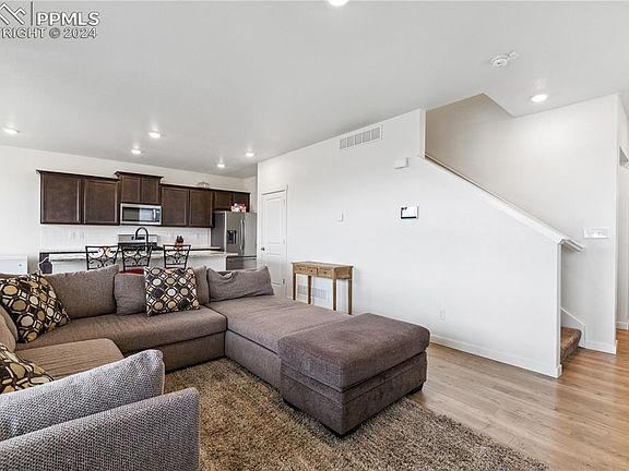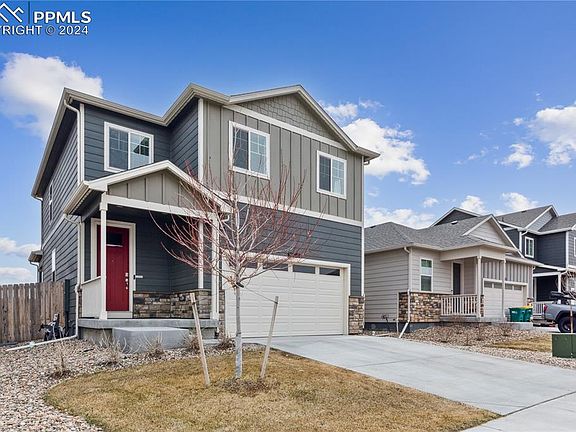 This impeccably maintained single-owner home boasts stunning curb appeal and pride in ownership. With a well-manicured front lawn leading to a covered porch. The open-concept floor plan is ideal for entertaining, featuring a spacious kitchen with an oversized granite peninsula island overlooking the living and dining areas and a fully fenced backyard. Additional highlights include tall kitchen cabinets, stainless steel appliances, and a subway-tiled backsplash. Gemstone permanent outside year-round lighting and paid off security system included with home. Conveniently located just minutes away from K-8 Grand Mountain school, shopping, restaurants, Shriever AFB, Peterson AFB, and Fort Carson, this home is sure to impress. Don't miss out—schedule your viewing today as this property won't stay on the market long!