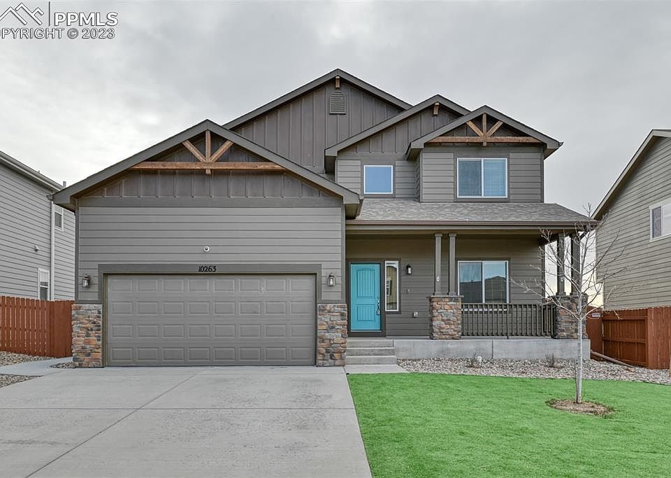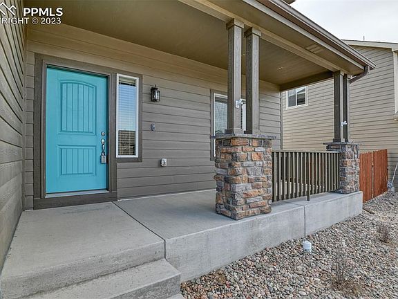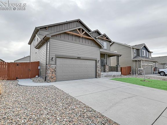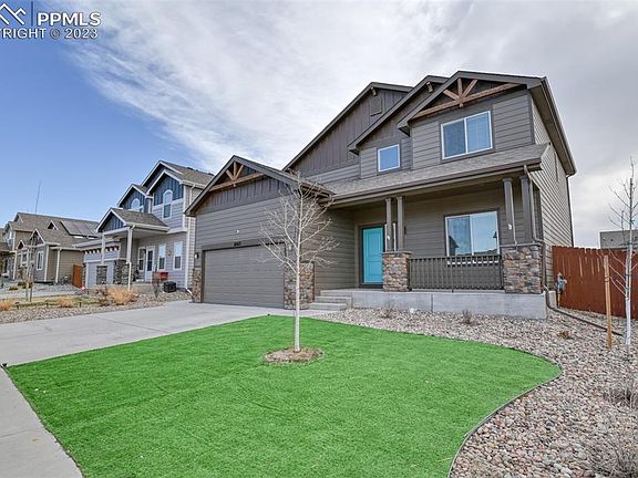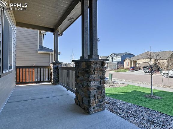 Gorgeous sparkling clean and move-in ready 5 bedroom 3 bath home complete with a 3 car tandem garage in coveted Meridian Ranch. Beautifully landscaped with low maintenance turf and level, fenced backyard. The front and back yards feature turf which is perforated so it is ideal for pets and easy to clean by hosing it off or simply use the automatic sprinkler system. Built in 2017, this beautiful home features solid granite countertops throughout. Main level features wood flooring throughout, kitchen complete with granite island, stainless steel appliances including a gas range, spacious living room, powder room and there is a walk-out to the backyard which features an upgraded, large concrete patio complete with built-in wood fire pit. Upstairs you'll find 4 bedrooms including the primary bedroom. Primary bedroom is spacious, with vaulted ceiling and 5 piece adjoining bathroom with large walk-in closet. You'll also find a perfectly convenient laundry room on the upper level. The finished basement features a large family room with freshly cleaned carpeting, neutral paint, window coverings installed and an additional bedroom and full bathroom with granite countertop. This home also features a basement rough-in for a future wet bar, whole house humidifier, central air and clear window well covers for the basement windows. This home is situated in the Meridian Ranch community which has an award-winning golf course, 42,000-square-foot Recreation Center with both indoor and outdoor pools, miles of trails, acres of open space and eight neighborhood parks, including the new 215-acre Falcon Regional Park. The park offers a dog park and two baseball fields. There is a low annual HOA fee as well as a Meridian Ranch Metropolitan District fee which covers Covenant Enforcement, Management, Sewer, Water, trash removal and access to the recreation centers.