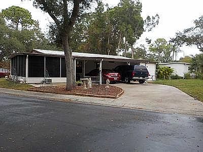 Gorgeous Lot! This open and spacious 2 bedroom, 2 bath home is located on a quiet cul-de-sac and sits on one of the largest lots in the community. INTERIOR: Entering into the home brings you directly to the very convenient inside laundry room. No need to go outside in the heat to do your laundry. The washer and dryer will also remain. The grand living/dining areas have that sought after open concept floor plan. The kitchen is also open to these rooms as well. All necessary appliances adorn the kitchen. A lovely built-in china cabinet allows for additional storage in the dining room. A slider is located just off of the living room and takes you to the front Florida room. This extensive porch allows for plenty of room for entertaining or visiting friends or family. The guest bedroom is ample sized and the guest bath has a shower and tub. The back of the home is the enormous primary bedroom with an en suite bath with walk-in shower. Gold tone fixtures embellish both baths. Trendy vinyl plank flooring flows through most of the home and is very durable. The ceiling fans, fireplace, ceiling ducts and size of the home are a few more favorable features. EXTERIOR: WOW-side by side parking for at least 4 cars and a golf cart. Very rare to find but a valuable asset. Vinyl siding, roof over, central heat and air, storage shed, awnings and a power outlet for a generator. The seller will add the generator and power cable with a full price offer. Enjoy the attractive mature trees and the shade that they provide. Bring along your pet to enjoy the dog park which is located across from the home. The asking price is $39,900. Call today for a private showing! COMMUNITY: Great location being nearby shopping, restaurants, banks, medical facilities, movie theater and more. The 55+ park offers many activities and a day at the pool and spa offers much relaxation. Shuffleboard, horseshoe pits and billiards are also offered. The monthly fee is $653.00 which includes lawn and garbage. Buy today and make Sugar Creek your place to call home! *The water is paid separately and is on its own meter*